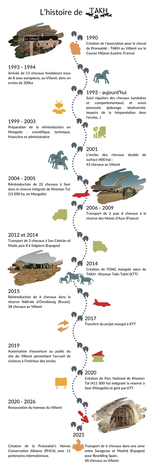 Sous l’impulsion de Luc Hoffmann (1923-2016), fondateur de la station biologique de la Tour du Valat, Claudia Feh, une éthologue spécialisée sur le comportement des chevaux vivant en semi-liberté, créée avec une équipe de biologiste l’association TAKH en 1990 pour la sauvegarde du cheval de Przewalski.